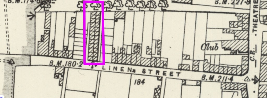 “South of Marble House, dwellings in Linen Street were built between 1820 and 1825, now replaced. By 1851 these included 24 back-to-back houses known as Union Buildings which are still (1966) standing.”