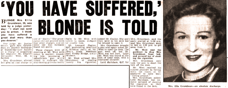 “Mrs. Ella Grundman, 39, was told by a judge yesterday: ” I shall not send you to prison. I think you have suffered a great deal more than you deserve.” The judge, Mr. Justice Oliver, gave Mrs. Grundman an absolute discharge at Cambridgeshire Assizes on a charge of assaulting her employer, Mr. Charles Alexander West, 59, a farmer.”