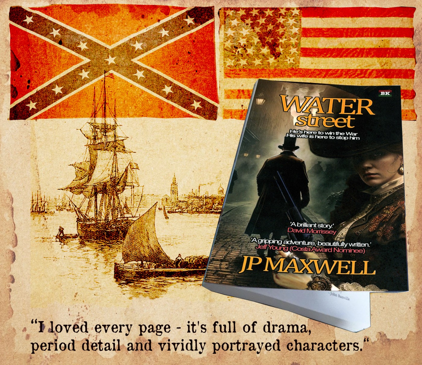 Water Street is a highly entertaining novel set in the summer of 1863, and features murder and mayhem involving Union and Confederate spies trying to outwit each other and advance their respective causes with the British government. Author JP Maxwell centres his tale around two women – Harriet Dunwoody and her creole companion Conté Louverture. Harriet is married to a grotesque man called Banastre Xavier Dunwoody, an ardent and violent secessionist who plans to swing the support of Britain’s government – led by a seriously ill Lord Palmerston – behind the cause of Jefferson Davies and the Confederate States. Harriet is playing a very dangerous double game, along with Conté, as they conspire behind Dunwoody’s back to thwart local efforts to boost support for the Confederacy. In doing so, they enlist the aid of a rather ramshackle band of Irish nationalists, led by a thug called Royston Chubb.
