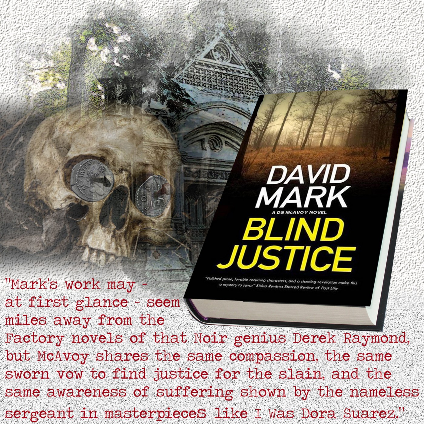 David Mark (right) writes with a sometimes frightening intensity as dark events swirl around Aector McAvoy. The big man, gentle and hesitant though he may seem, is, however, like a rock. He is one of the most original creations in a very crowded field of fictional British coppers, and his capacity to bear pain for others – particularly in this episode his son Fin and Trish Pharoah – is movingly described. Mark’s work may – at first glance – seem miles away from the Factory novels of that Noir genius Derek Raymond, but McAvoy shares the same compassion, the same sworn vow to find justice for the slain, and the same awareness of suffering shown by the nameless sergeant in masterpieces like I Was Dora Suarez.