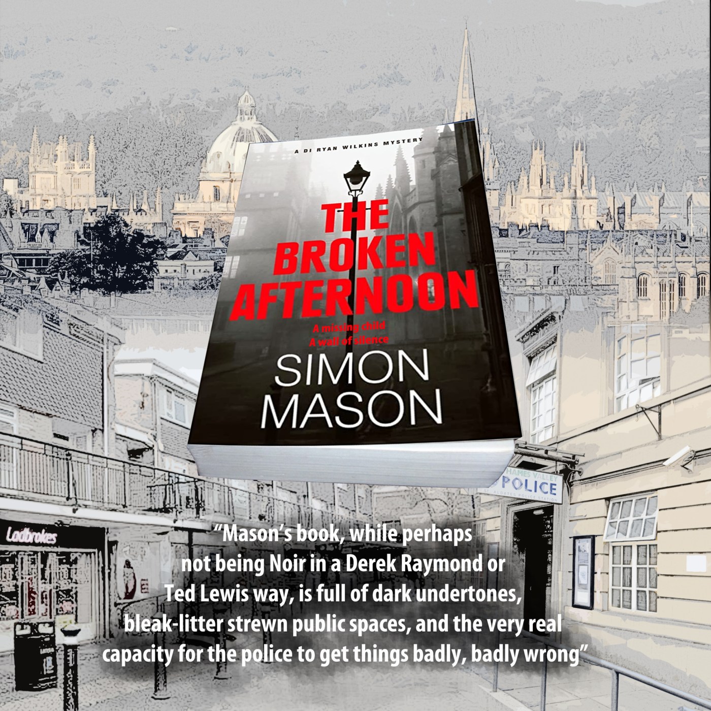 I am sorry, but that is not how I see this book. Yes, it is set in and around Oxford, but apart from The Broken Afternoon being every bit as good a read as, say, The Silence of Nicholas Quinn or The Remorseful Day, that’s where the resemblance ends. Mason’s book, while perhaps not being Noir in a Derek Raymond or Ted Lewis way, is full of dark undertones, bleak litter strewn public spaces, and the very real capacity for the police to get things badly, badly wrong. Simon Mason (right) has created coppers who certainly don’t spend melancholy evenings gazing into pints of real ale and then sit home alone listening to Mozart while sipping a decent single malt.